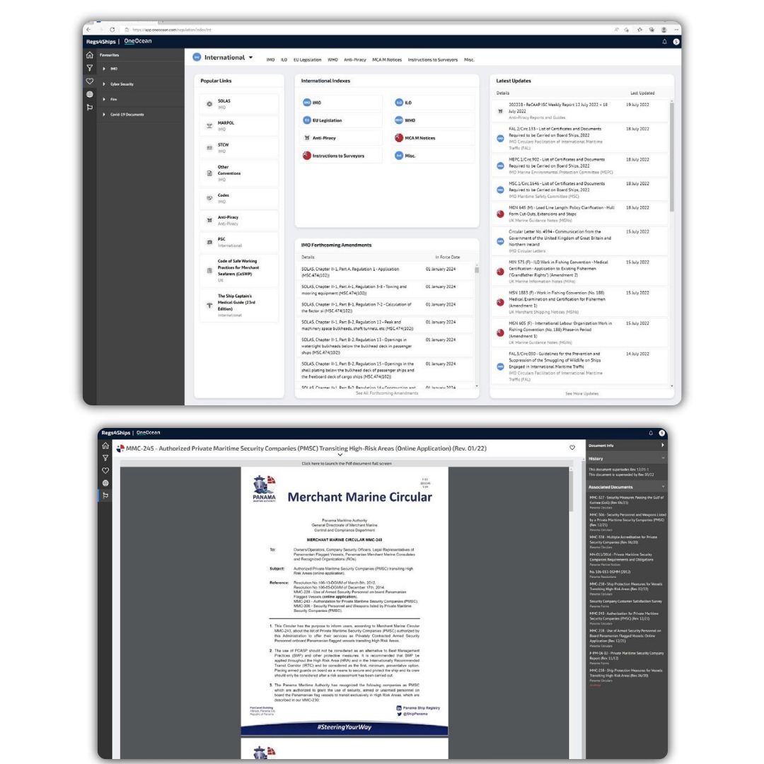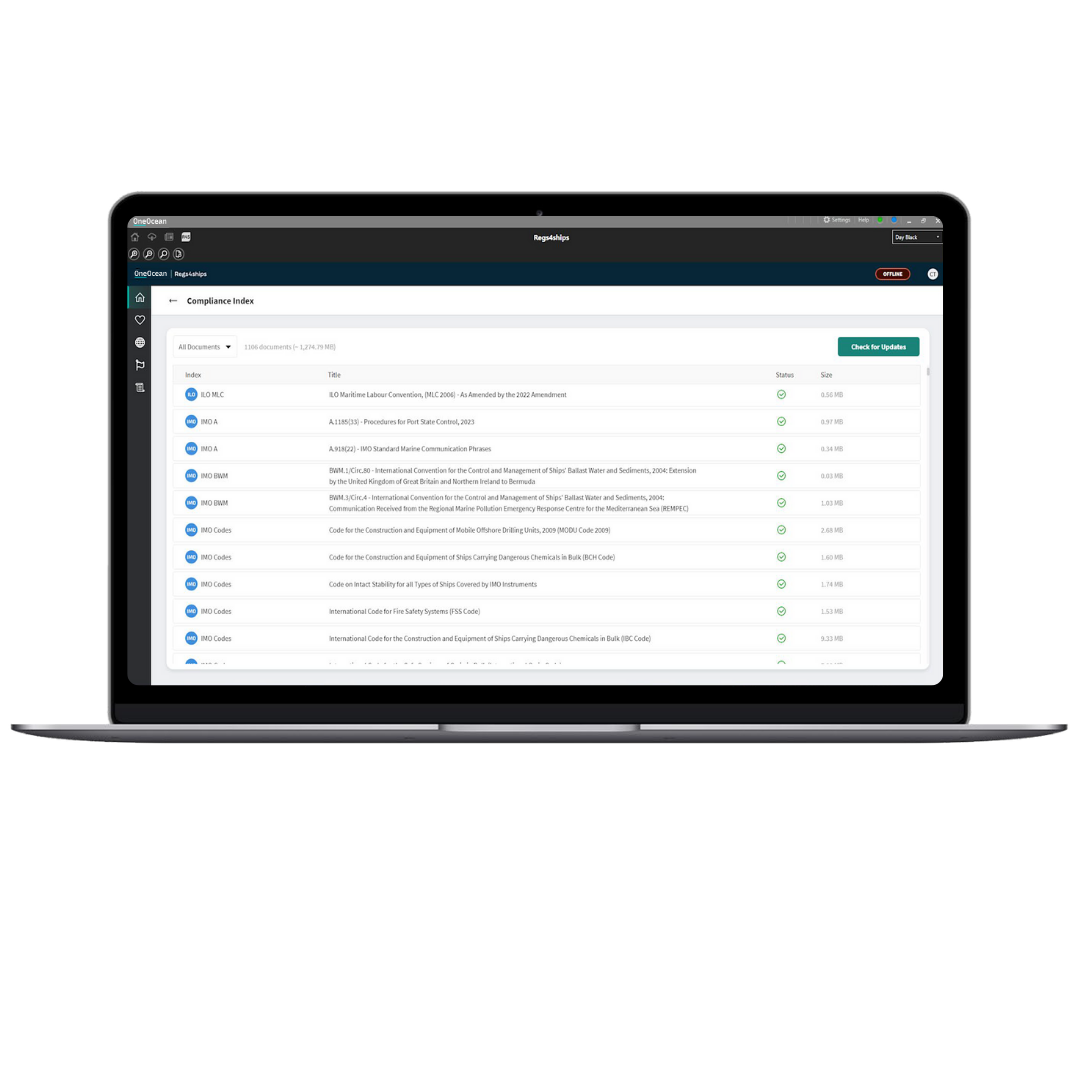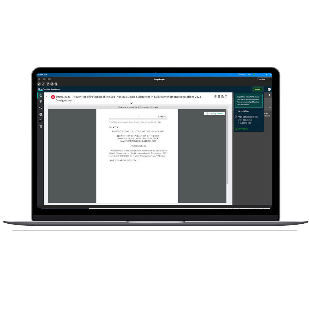 Regs4ships provides uninterrupted access to live and archived regulatory publications – covering not just IMO content but multiple sources, including the ILO and numerous flag states. Fully digital, it is a centralised solution for accessing regulatory information, ensuring that crews and shoreside teams have the most up-to-date compliance data at their fingertips, even when offline.
